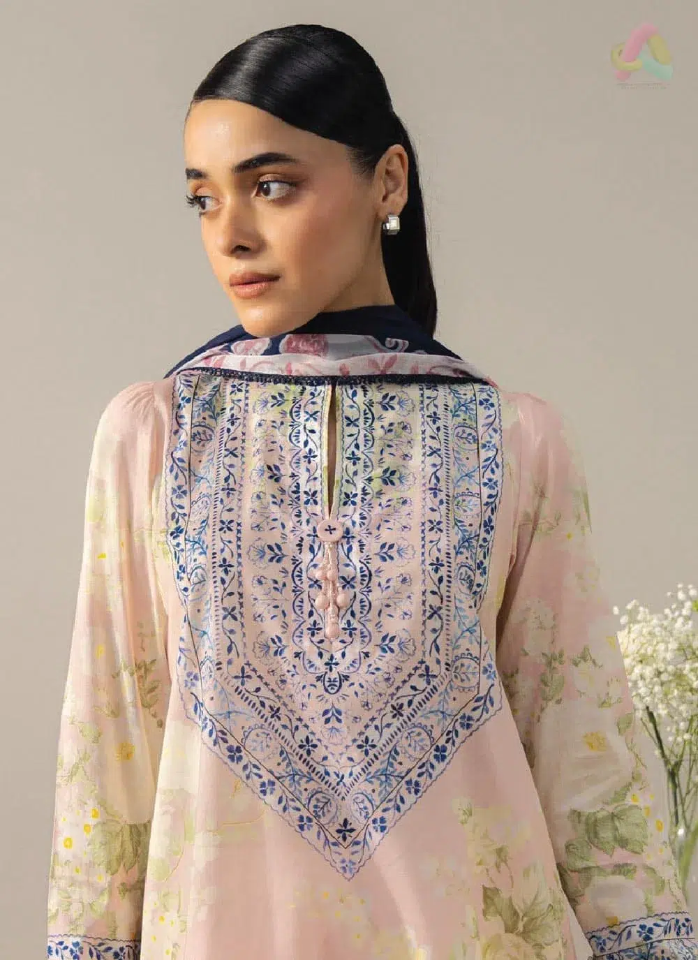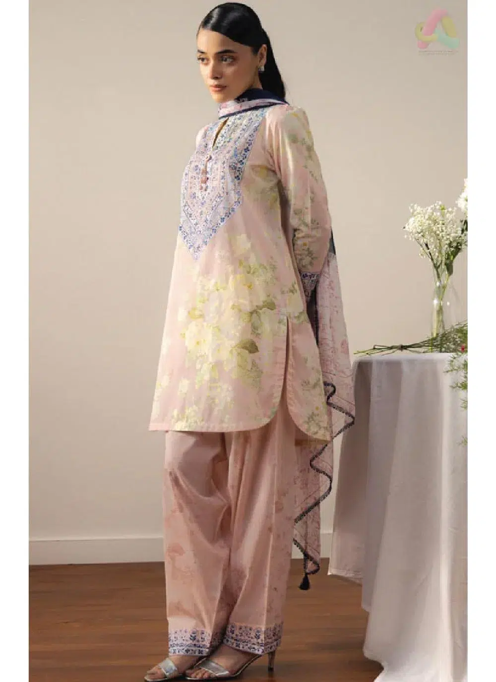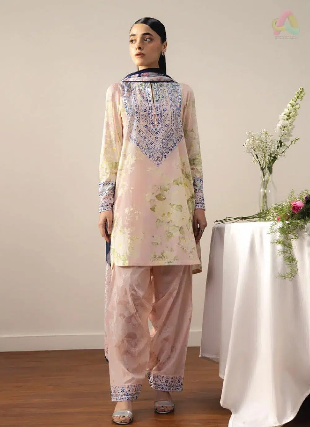 The digital printed chiffon dupatta moves with you, its fluid drape softening the overall silhouette with quiet grace. Rather than sitting stiff or bunching awkwardly, it layers over the look the way a dupatta should — naturally and effortlessly. Grounding the whole ensemble is the digital printed cambric trouser, structured enough to hold its shape through the day yet comfortable enough that you will not be counting the minutes until you change.