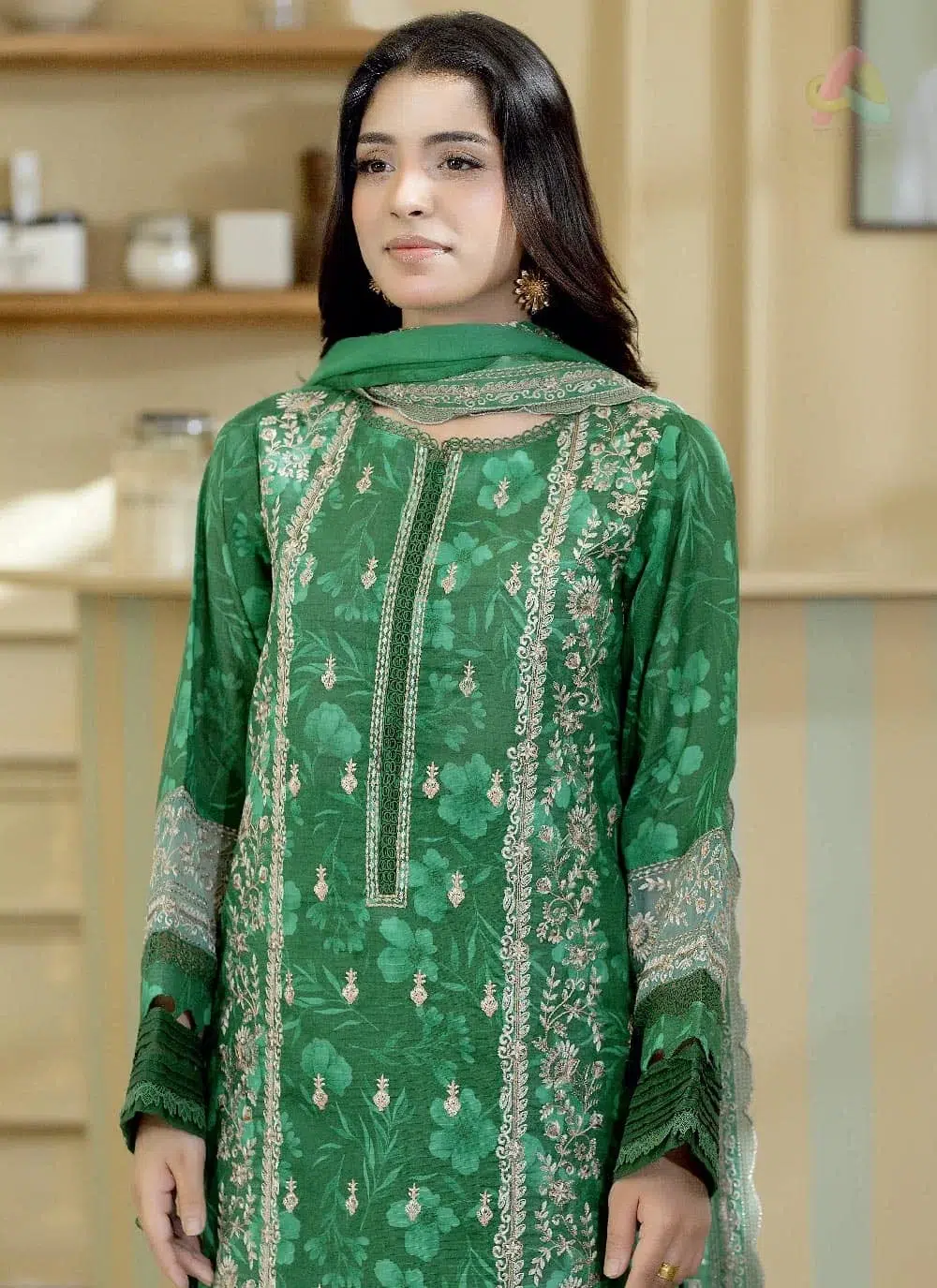 The embroidered and printed lawn front offers a perfect balance of texture and pattern, giving the outfit a graceful yet modern appeal. Made from high-quality lawn fabric, it ensures breathability and comfort throughout the day, even in warmer weather.