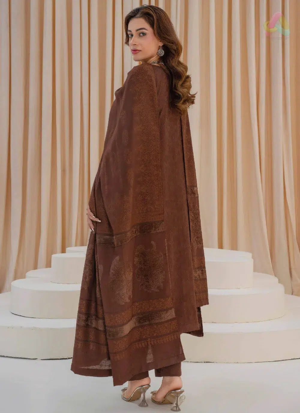 Add timeless grace to your festive wardrobe with Libaas by Mahay Vol 2 ART-02, a premium 3-piece ensemble designed with elegance and comfort in mind. This outfit features a fancy zari jacquard shirt that beautifully blends traditional craftsmanship with a modern silhouette. Paired with a luxurious velvet jacquard shawl, it adds richness and sophistication, while the plain trouser completes the look with subtle balance.