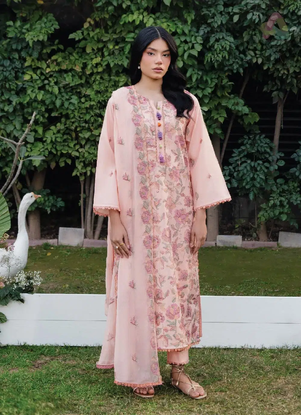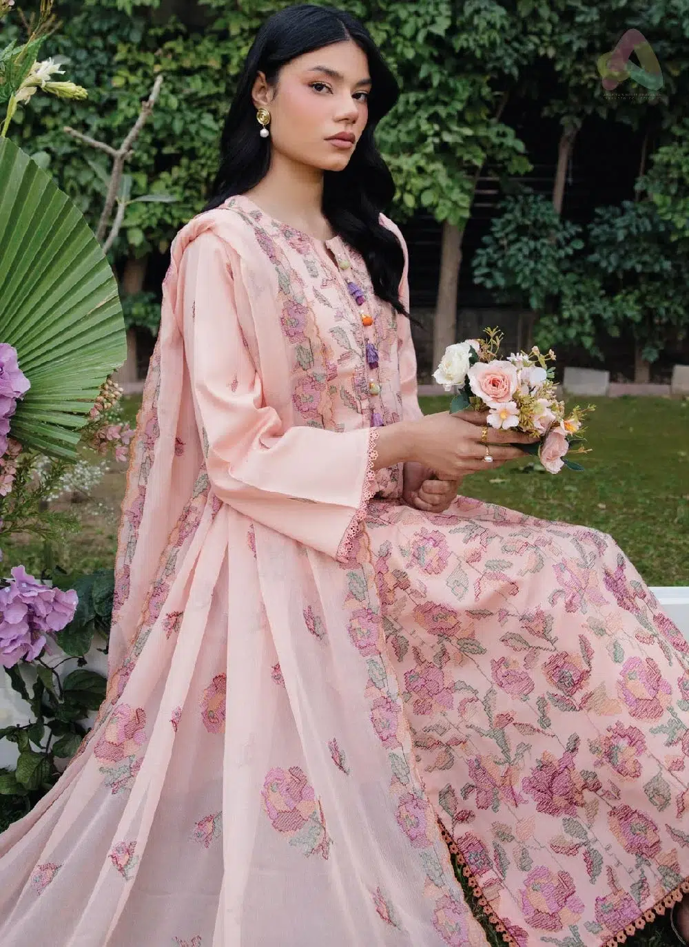A standout element is the organza embroidered pati on the daman, adding texture and a soft decorative finish. The printed chiffon dupatta introduces a lightweight and airy feel, perfect for warm weather styling. Paired with a solid trouser, the outfit ensures comfort without compromising on style.